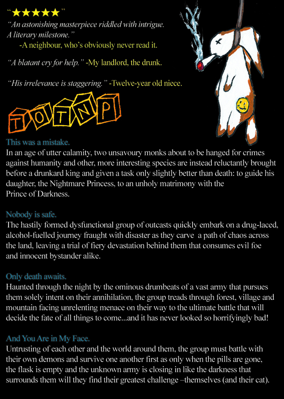 It was during this time that I started a new project, a complete reversal of the very thing I was trying so hard to create in both style and subject matter. It was the satire of a common fairy tale that surrounded two characters I had created based on my very colourful best-friend and his flighty hippy girlfriend at the time (God bless her magical soul). The whole thing started off as a joke with a very long punch-line and before you knew it I was halfway done and loving every minute of writing it. I had never approached comedy before but quickly became rather hooked on seeing what kind of off-beat characters and calamitous situations I could come up within the context of the story. Fourteen chapters and one-hundred and thirteen thousand words later I was finished.